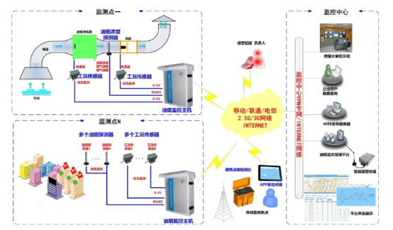 油煙監(jiān)測(cè)系統(tǒng)是為滿足環(huán)保行業(yè)特殊需求,利用物聯(lián)網(wǎng)感知技術(shù)、GPRS 無(wú)線通信技術(shù)等開(kāi)發(fā)的一套高性能的集油煙監(jiān)測(cè)、數(shù)據(jù)采集、數(shù)據(jù)傳輸為一體的系統(tǒng)。可對(duì)企業(yè)油煙排放濃度、凈化器運(yùn)行狀態(tài)、風(fēng)機(jī)運(yùn)行狀態(tài)等指標(biāo)進(jìn)行在線監(jiān)控,從而將油煙治理設(shè)施工況數(shù)據(jù)與油煙濃度數(shù)據(jù)統(tǒng)一起來(lái),為環(huán)保局提供直接有效且真實(shí)的油煙排放狀況的專(zhuān)用油煙監(jiān)測(cè)設(shè)備。