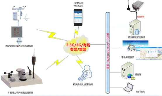 統(tǒng)由前端監(jiān)測(cè)設(shè)備、傳輸網(wǎng)絡(luò)和中心平臺(tái)三部分組成。前端監(jiān)測(cè)設(shè)備由車(chē)載式或固定式揚(yáng)塵噪聲監(jiān)測(cè)儀組成。