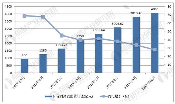 從“九五”時(shí)期開(kāi)始,我國(guó)政府高度重視環(huán)境保護(hù)工作,環(huán)境保護(hù)投資呈現(xiàn)快速增長(zhǎng)趨勢(shì)。整個(gè)“九五”期間環(huán)境保護(hù)投資3600億元,是“八五”期間環(huán)境保護(hù)投資的0.93%。據(jù)前瞻產(chǎn)業(yè)研究院發(fā)布的《2017-2022年中國(guó)環(huán)保行業(yè)發(fā)展前景與投資預(yù)測(cè)分析報(bào)告》數(shù)據(jù)顯示,截止2017年10月底,累計(jì)環(huán)保財(cái)政支出突破4000億,同比增長(zhǎng)28.0%。